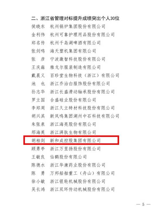 近日,浙江省经济和信息化厅公布2021年浙江省企业管理对标提升标杆企业和成绩突出个人名单。集团公司党委书记胡柏剡老师荣获“企业管理对标提升成绩突出个人”称号,这不仅是对胡柏剡老师在推进企业高质量发展方面做出突出贡献的嘉奖,也是对新和成发展成果的肯定。